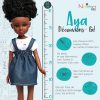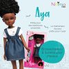 Aya is an African American Barbie Doll with Realistic Natural Hair and Accessories for Ages 3+ by NaimaDolls. NaimaDolls is an Ivorian company created and run by women, specializing in the creation of Toys inspired by African culture. The doll is made of safe plastic that is comfortable to touch and has rotatable arm and leg joints made of rubber. She wears a jumper dress and sneakers. Her head can turn 360°, and she can sit up and lay down. If dirty, she can be easily cleaned with a damp towel, and her clothes can be washed so they look brand new. It comes with 6 Accessories: Sneakers, Brush, Hair clips, and Scrunchie.