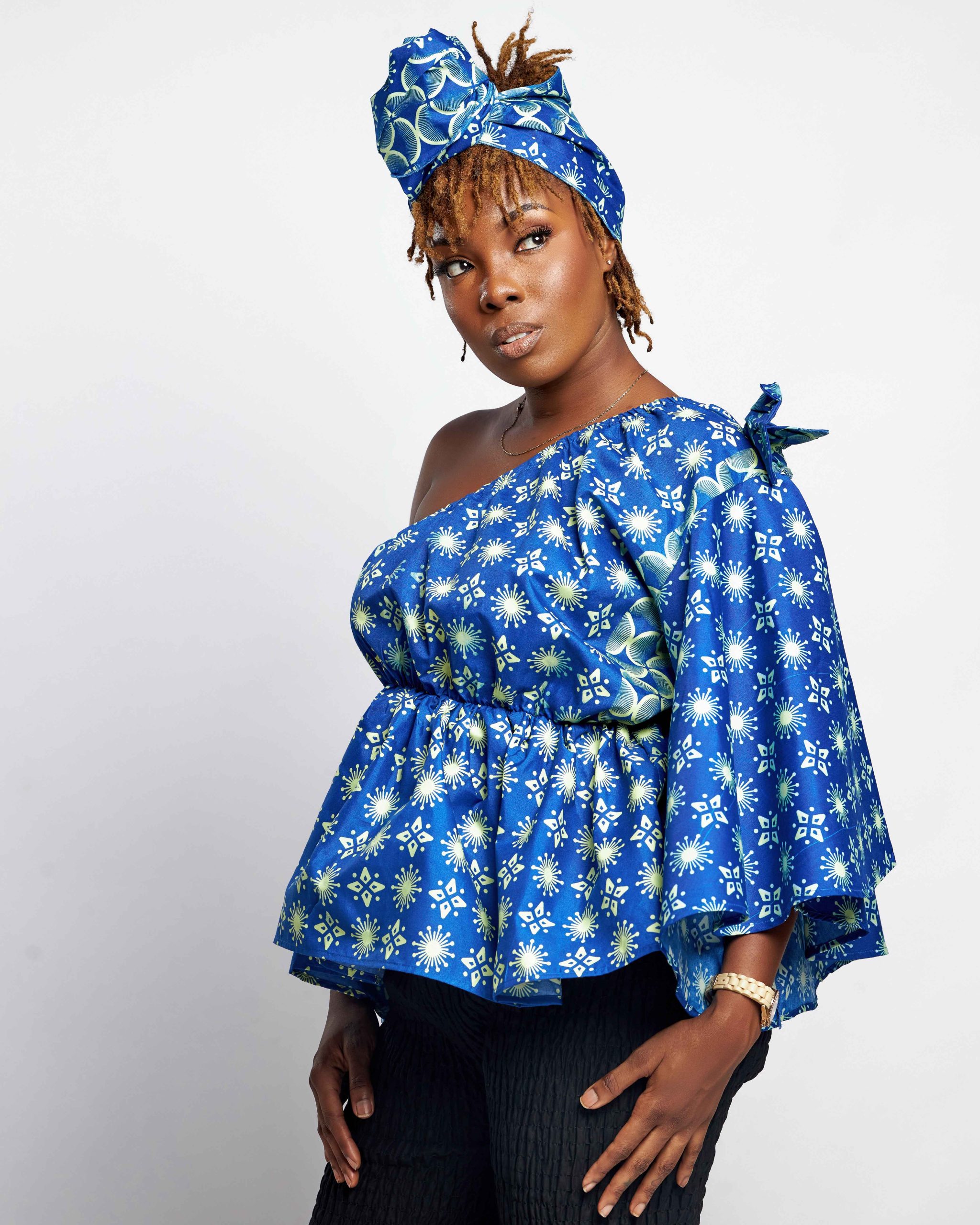 Description: African Clothing for Women. This classic piece is a unique one-shoulder Ankara top, perfect for various social gatherings and ceremonies. Its beauty can be showcased as-is or elevated with one of our chic faux leather belts. For an impressive Afrocentric look, pair it with a matching head wrap. The fabric is lightweight, soft to the touch, and comfortable, making it ideal for parties, smart casual corporate events, and family reunions.making them an ideal choice for outdoor gatherings. Made in Africa. Retail and Wholesale